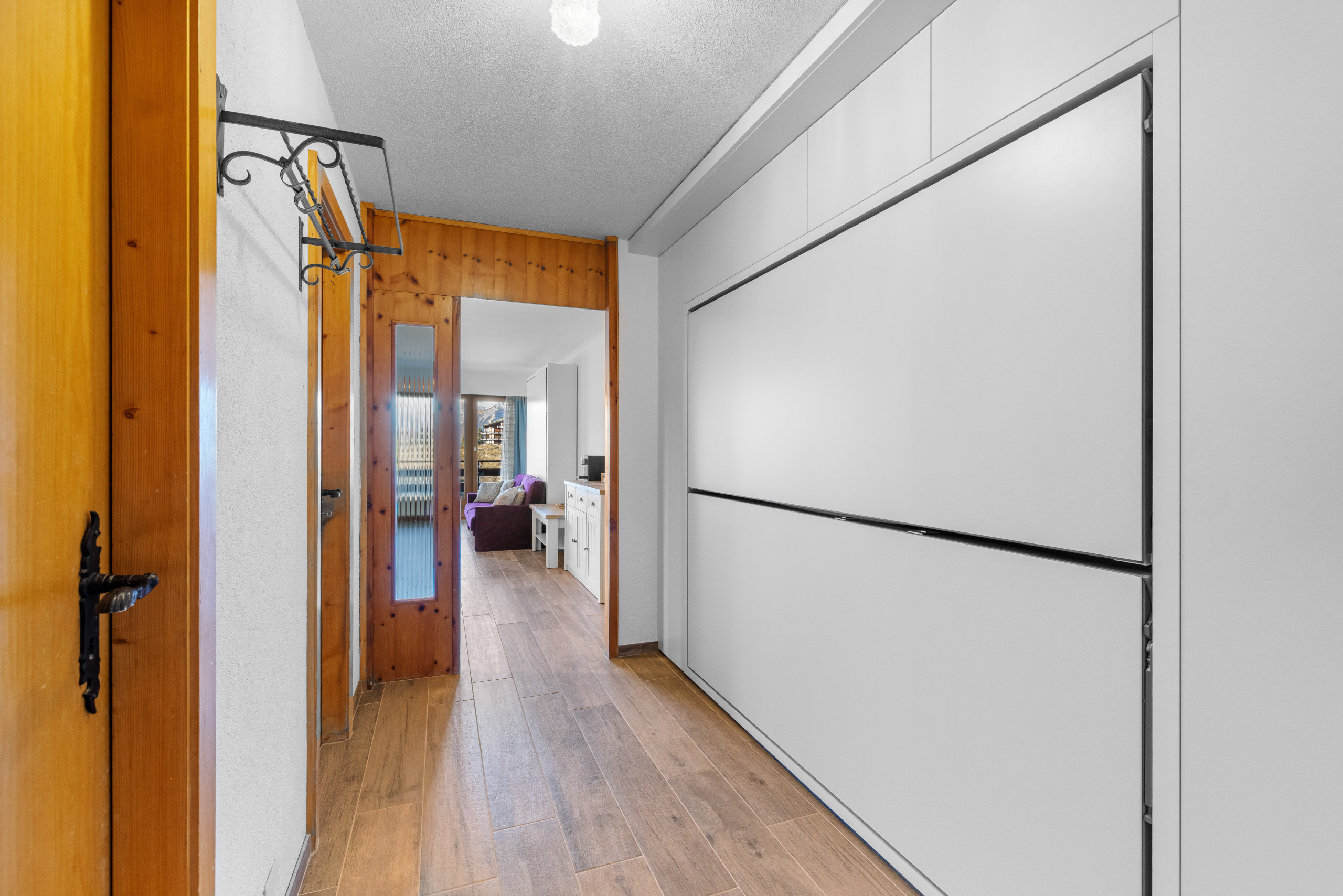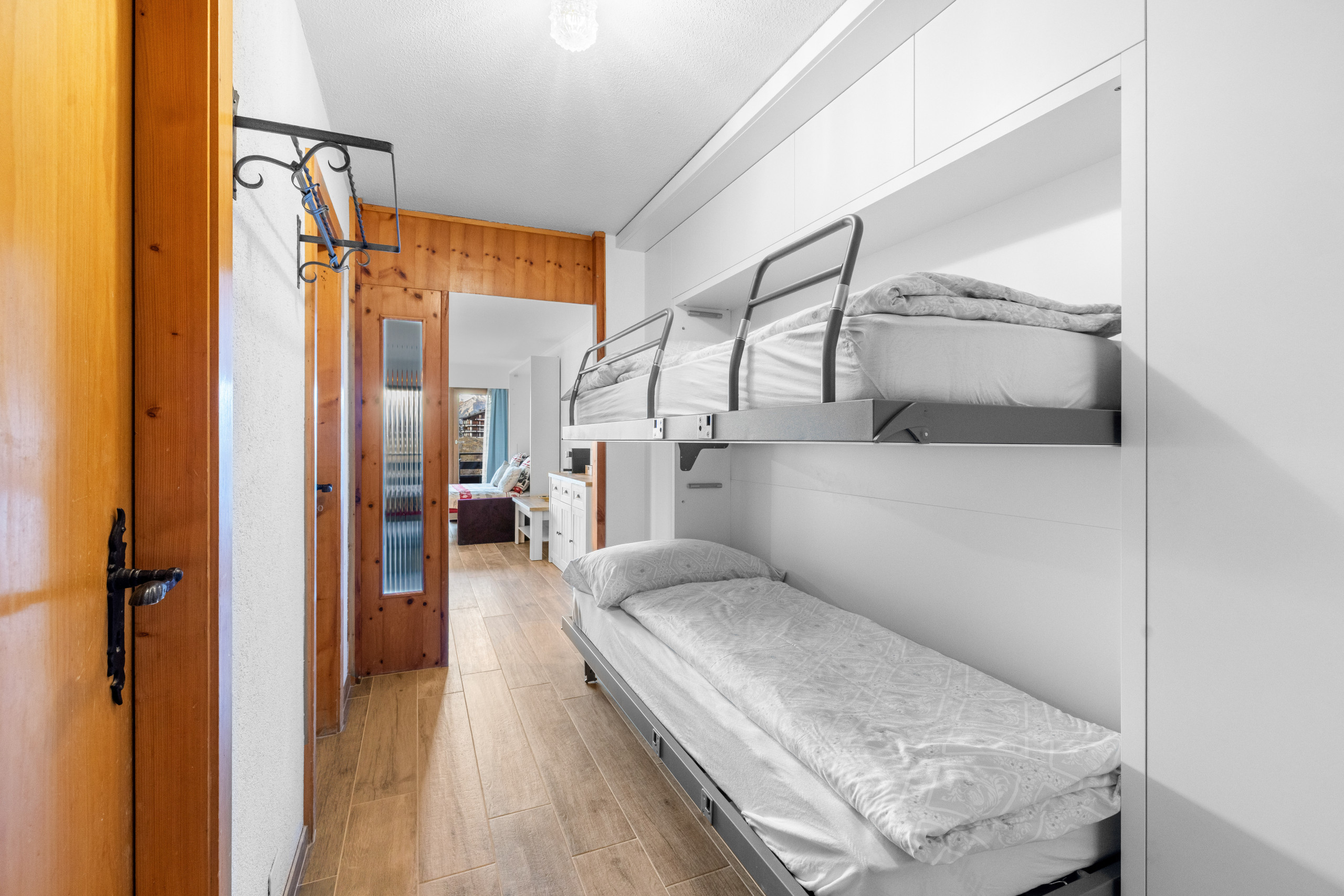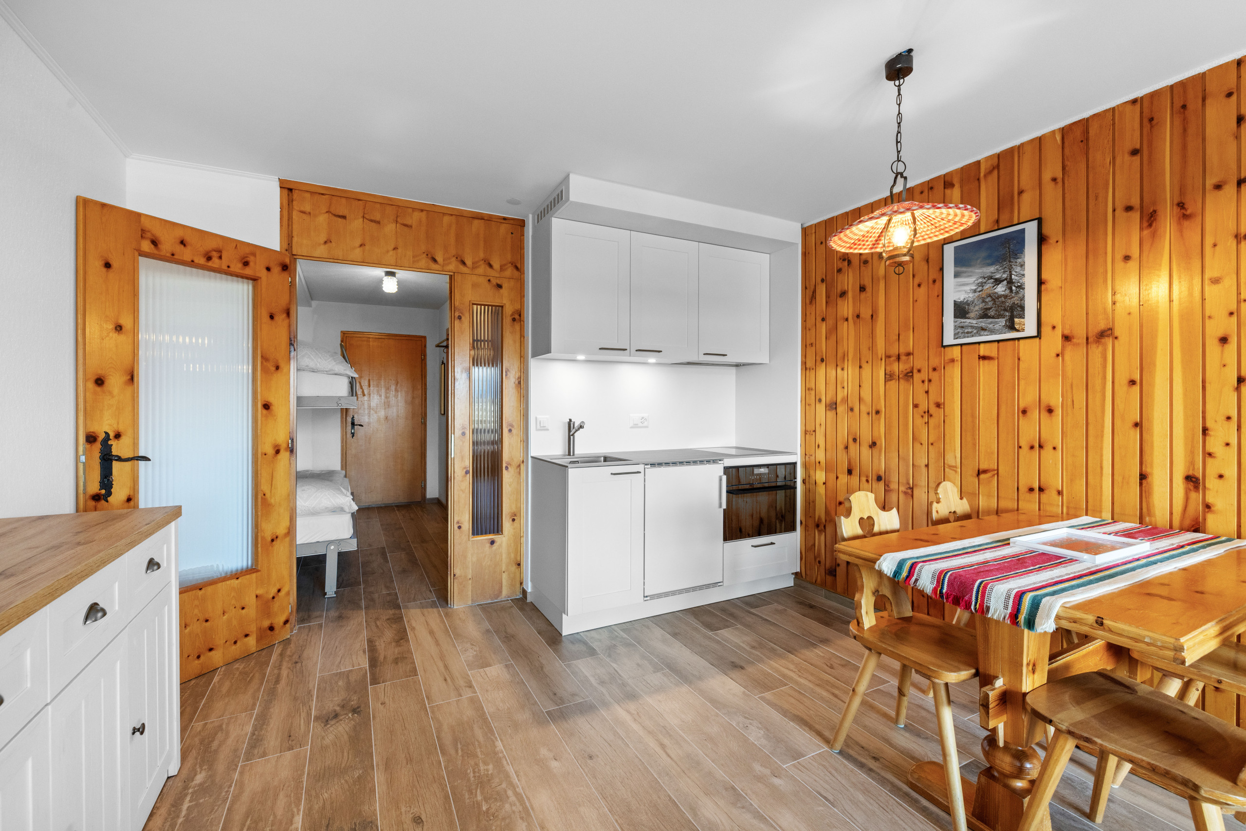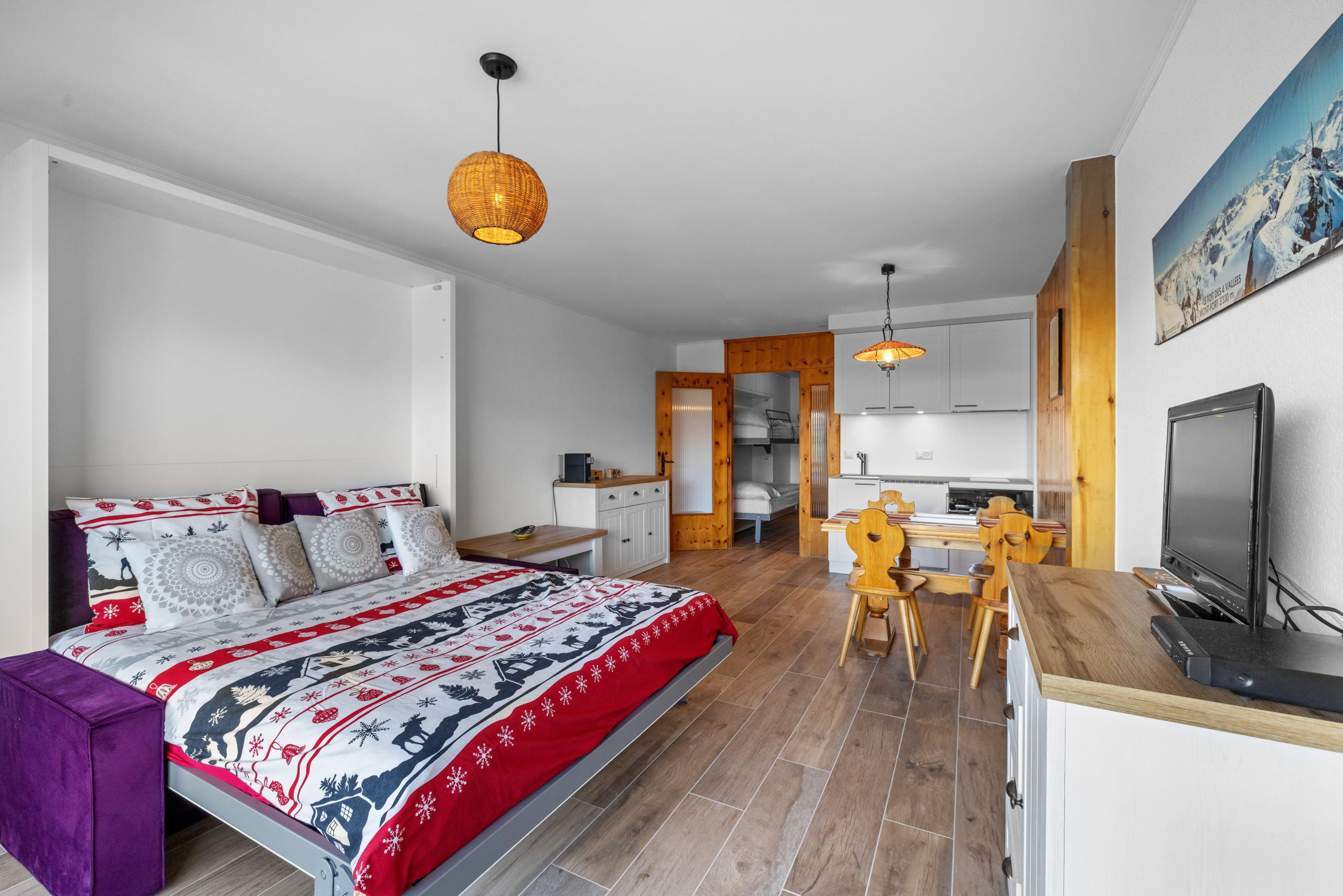 Verteilung: Eingang mit klappbarem Hochbett, 1 Badezimmer mit Badewanne, WC und Waschbecken, Wohnbereich mit offener Küche, Essecke, Wohnzimmer mit Schlafsofa für 2 Personen, TV, WLAN über Swisscom-Box; Zugang vom Wohnzimmer zum nach Norden ausgerichteten Balkon.