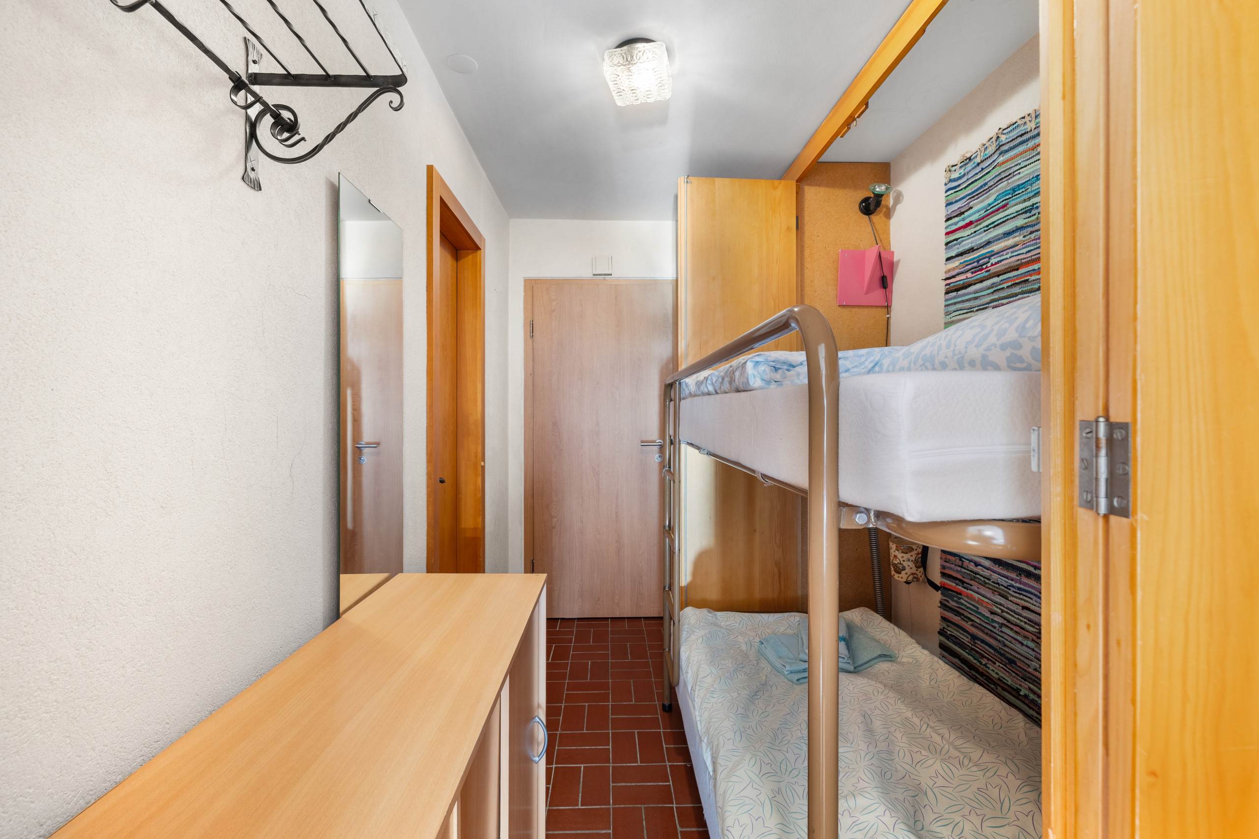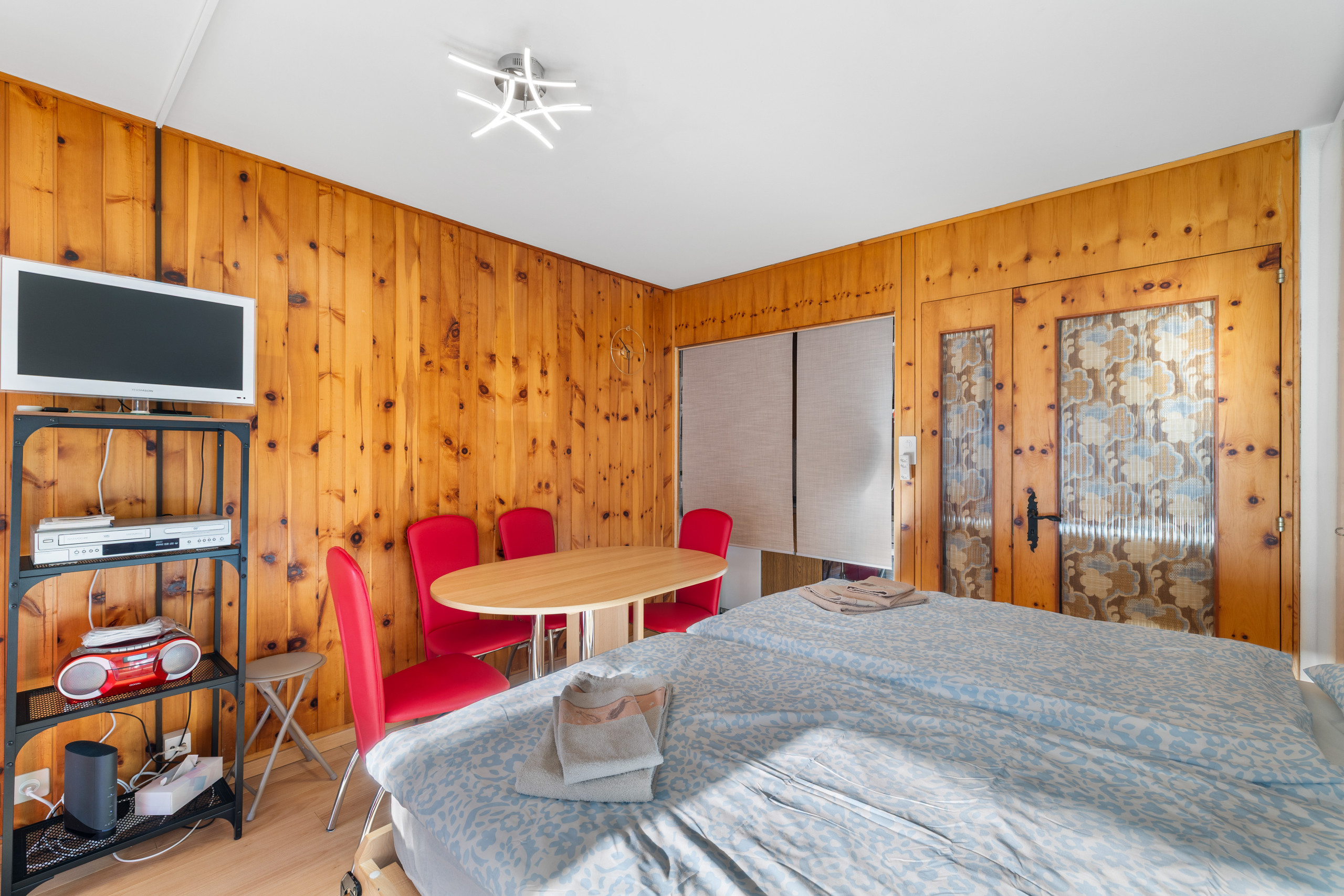 Eingang mit klappbaren Stockbetten (Matratzen 90x190 cm), offene, ausgestattete Küche (Elektroherd, Backofen, Kühlschrank, Dolce-Gusto-Kaffeemaschine) - Aufenthaltsraum mit Essecke, Wohnbereich mit 2 klappbaren Betten (Matratzen 90x190 cm), TV, WLAN - 1 Badezimmer mit Badewanne, WC und Waschbecken.