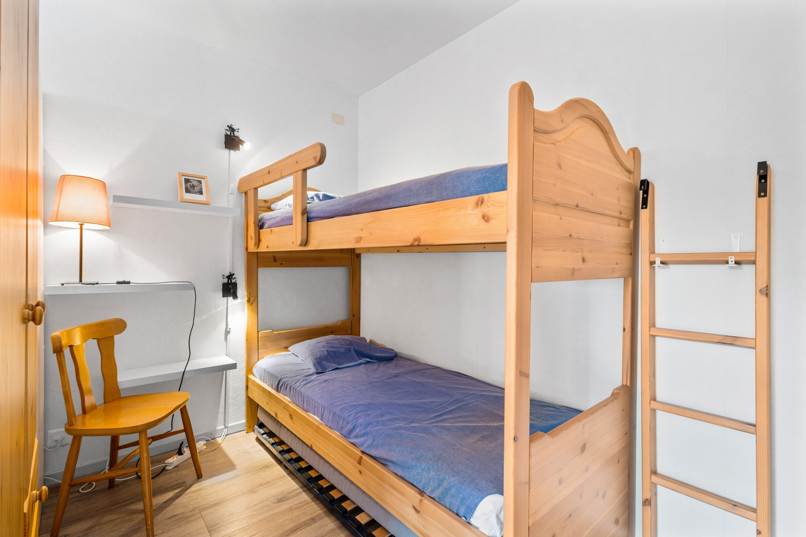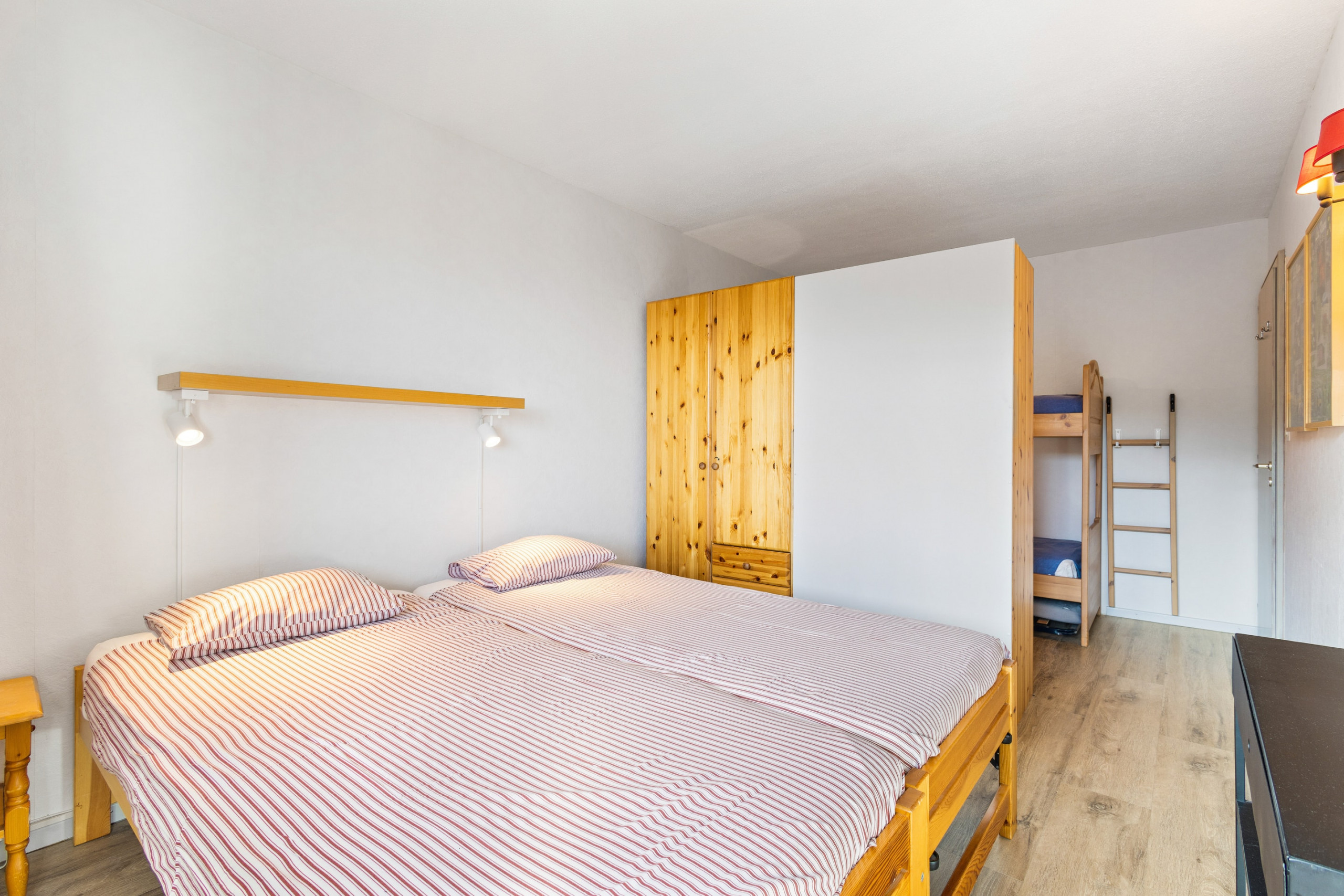 Entrance with storage, living room with corner sofa and sofa bed (140cm), TV and access to east-facing balcony, open-plan kitchen equipped (ceramic hob, oven, refrigerator, freezer, dishwasher, microwave and Nespresso coffee machine), dining area, 1 bedroom with double bed with access to 2nd balcony (15m2), 1 bedroom with 2 beds and 1 bunk bed, 1 bathroom with shower, WC and washbasin, 1 bathroom with bathtub, WC and washbasin.