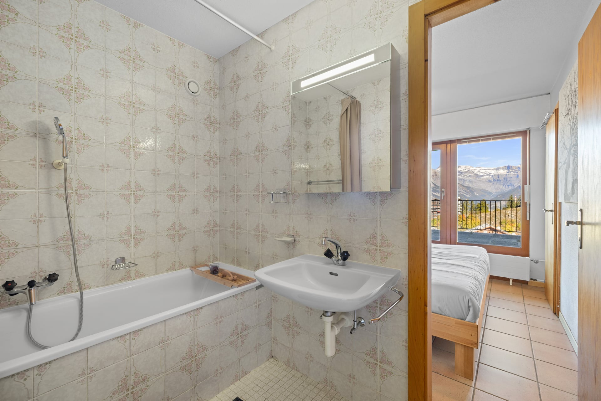 Layout: entrance with foldaway bunk bed (sleeps 2, max. 40 kg/bed), 1 bathroom with bath, toilet and washbasin, living room with small open kitchen, dining area, sitting room with sofa bed for 2, TV, wifi via Swisscom box; access from the living room to the north-facing balcony.