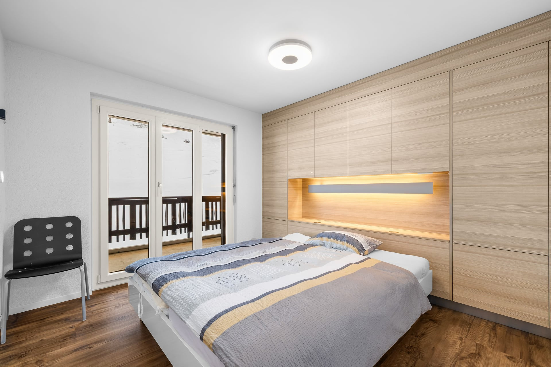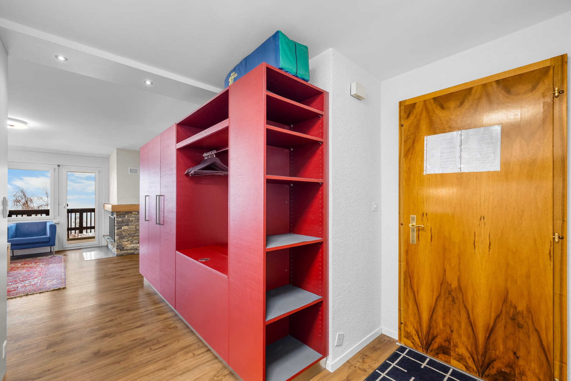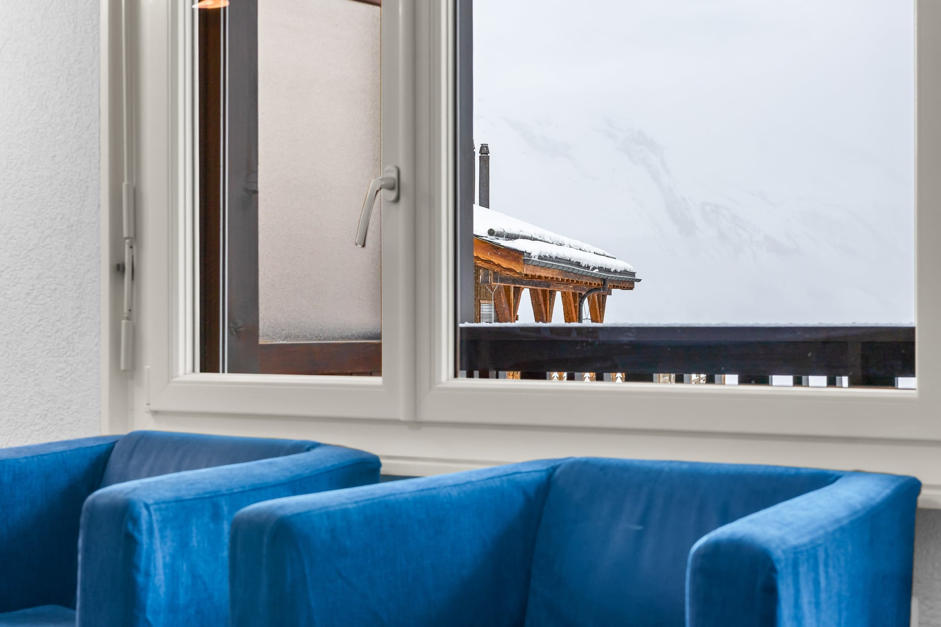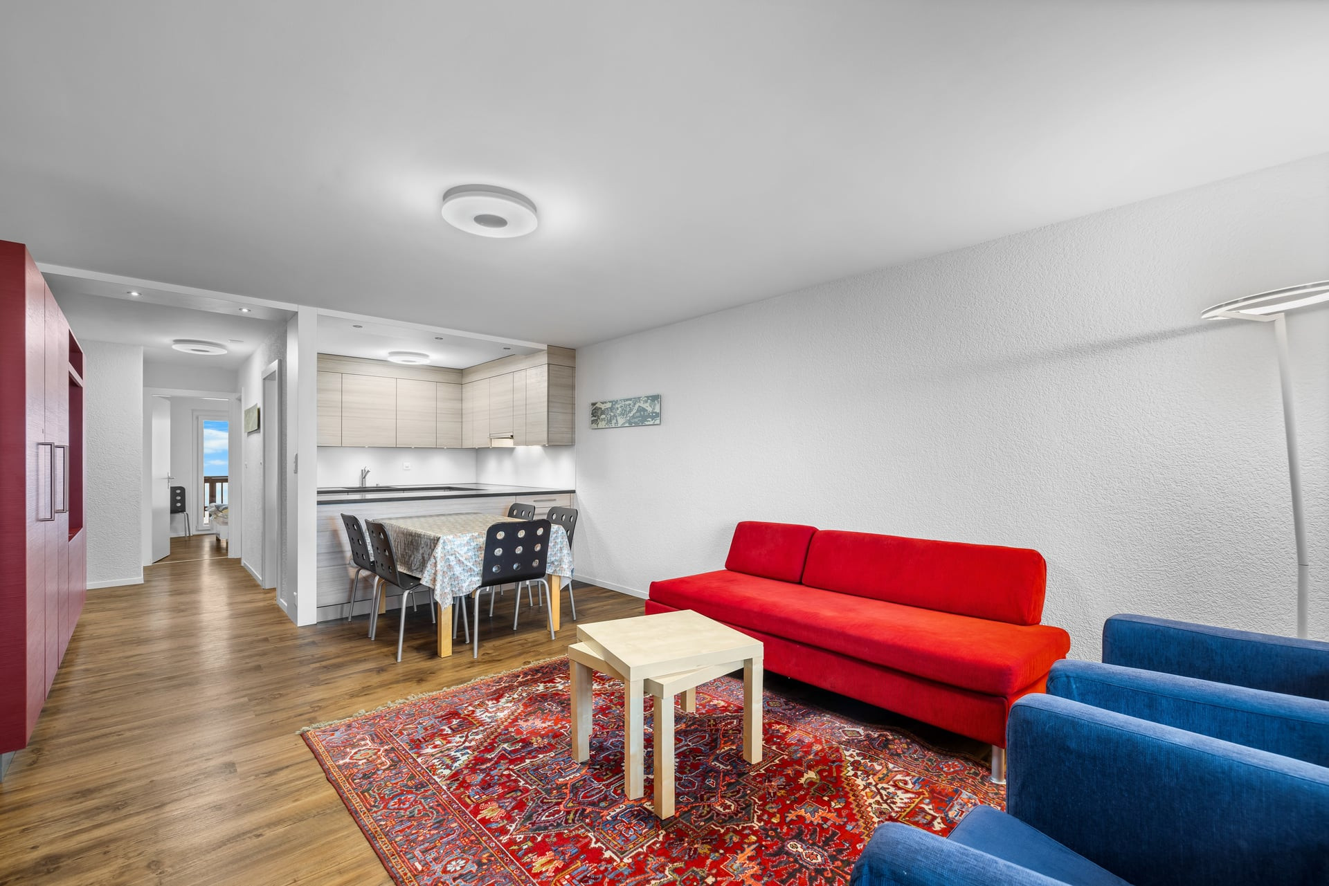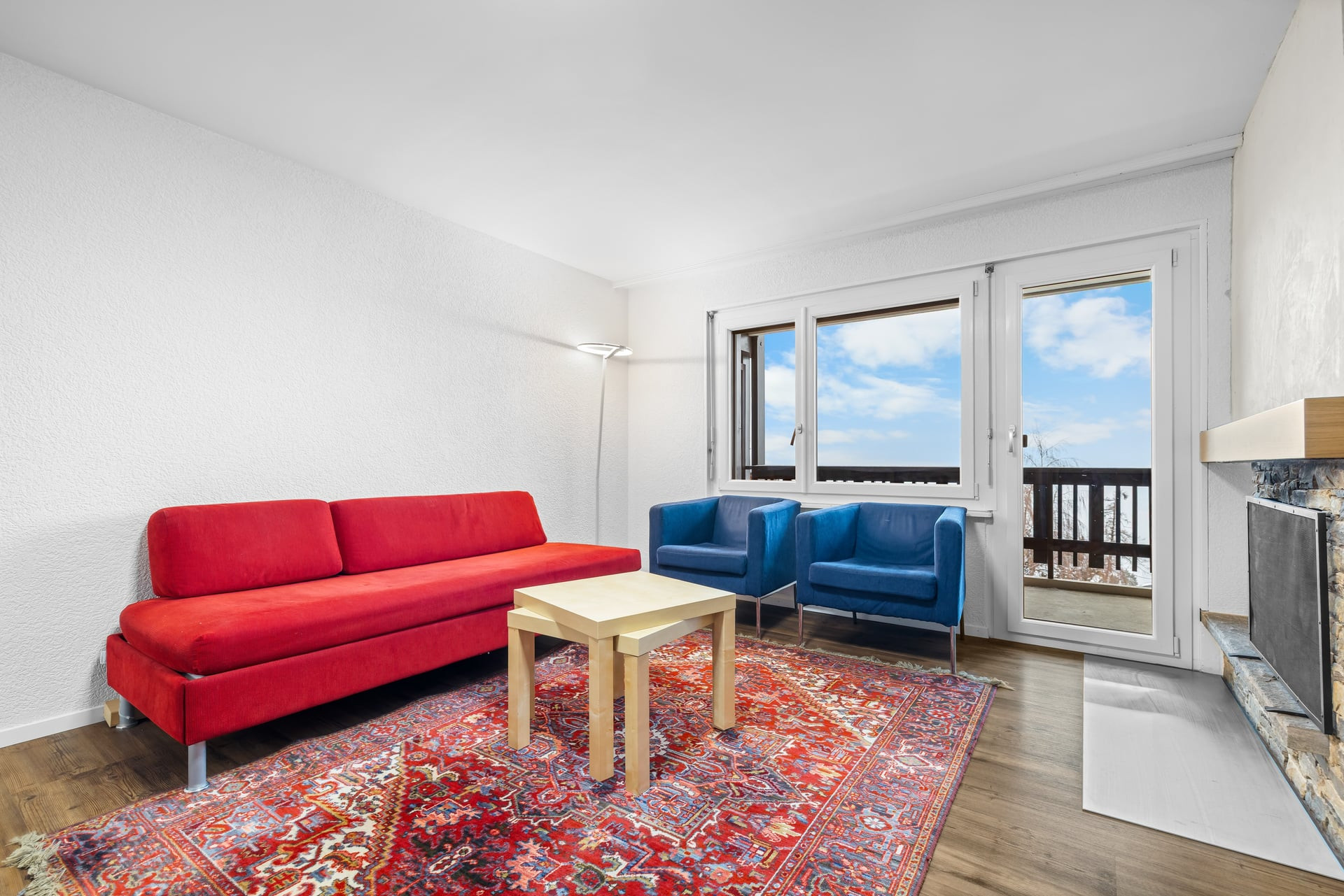 Distribution: entrance with fold-down bunk bed, 1 bathroom with bathtub, toilet and washbasin, living room with small open kitchen, dining area, lounge with sofa bed for 2 people, TV, wifi via Swisscom box; access from the lounge to the north-facing balcony.