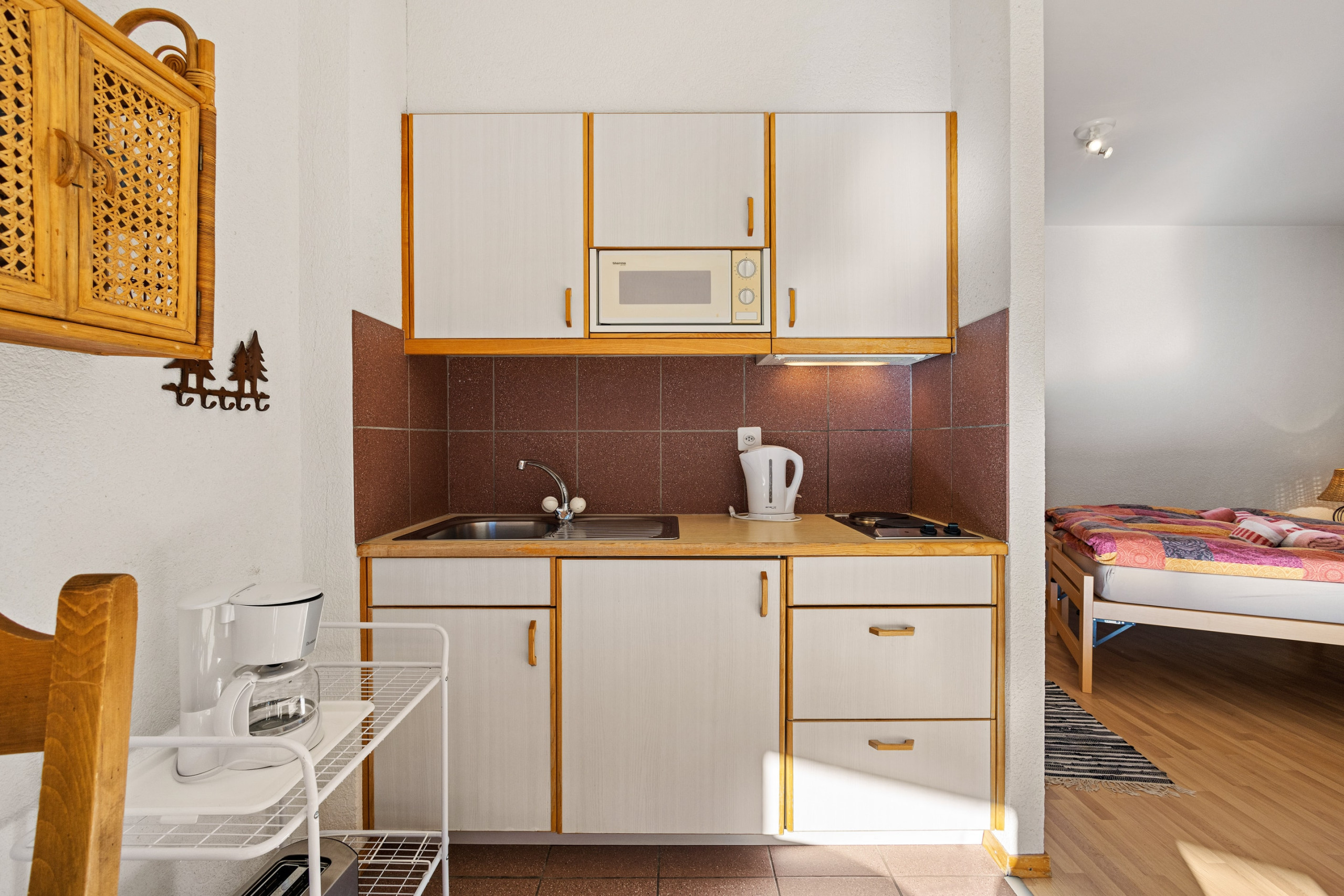 The apartment is fully equipped to provide you with all the necessary comfort. The open-plan kitchen is functional and has all the basic equipment (refrigerator, coffee maker, crockery, etc.). The living room, with its double sofa bed, will allow you to relax after a day on the slopes. The bathroom with shower completes the amenities.