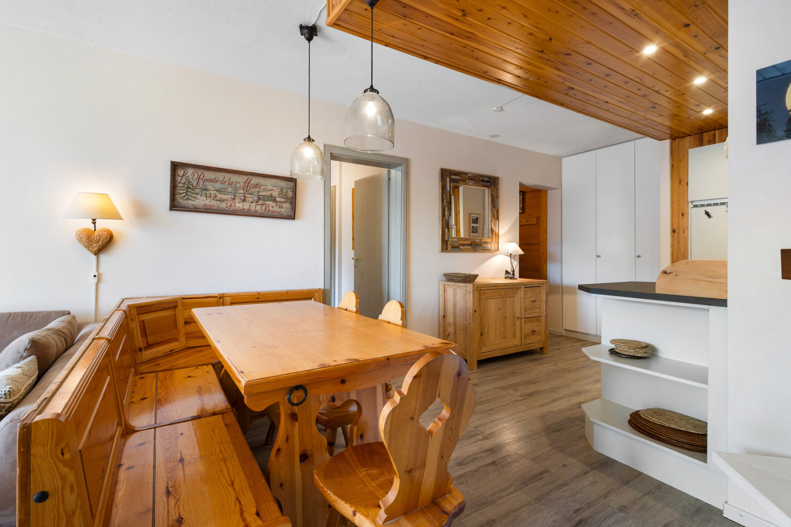 Ingresso con ripostiglio, soggiorno con divano ad angolo e divano letto (140 cm), TV e accesso al balcone esposto a est, cucina a vista completamente attrezzata (piano cottura in vetroceramica, forno, frigorifero, congelatore, lavastoviglie, forno a microonde e macchina da caffè Nespreso), zona pranzo, 1 camera matrimoniale con accesso al 2° balcone (15 m2), 1 camera con 2 letti e 1 letto a castello, 1 bagno con doccia, WC e lavabo, 1 bagno con vasca, WC e lavabo.