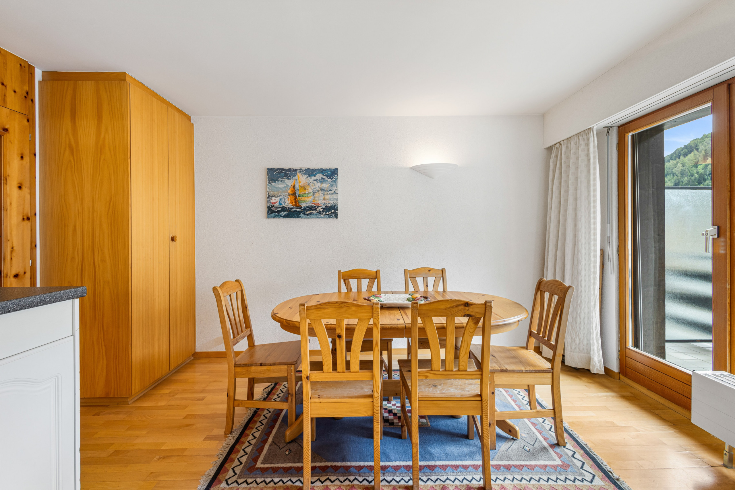 Distribuzione: ingresso con letto a castello ribaltabile, 1 bagno con vasca, wc e lavabo, soggiorno con piccola cucina aperta, angolo pranzo, salotto con divano-letto per 2 persone, TV, wifi tramite box Swisscom; accesso dal salotto al balcone esposto a nord.
