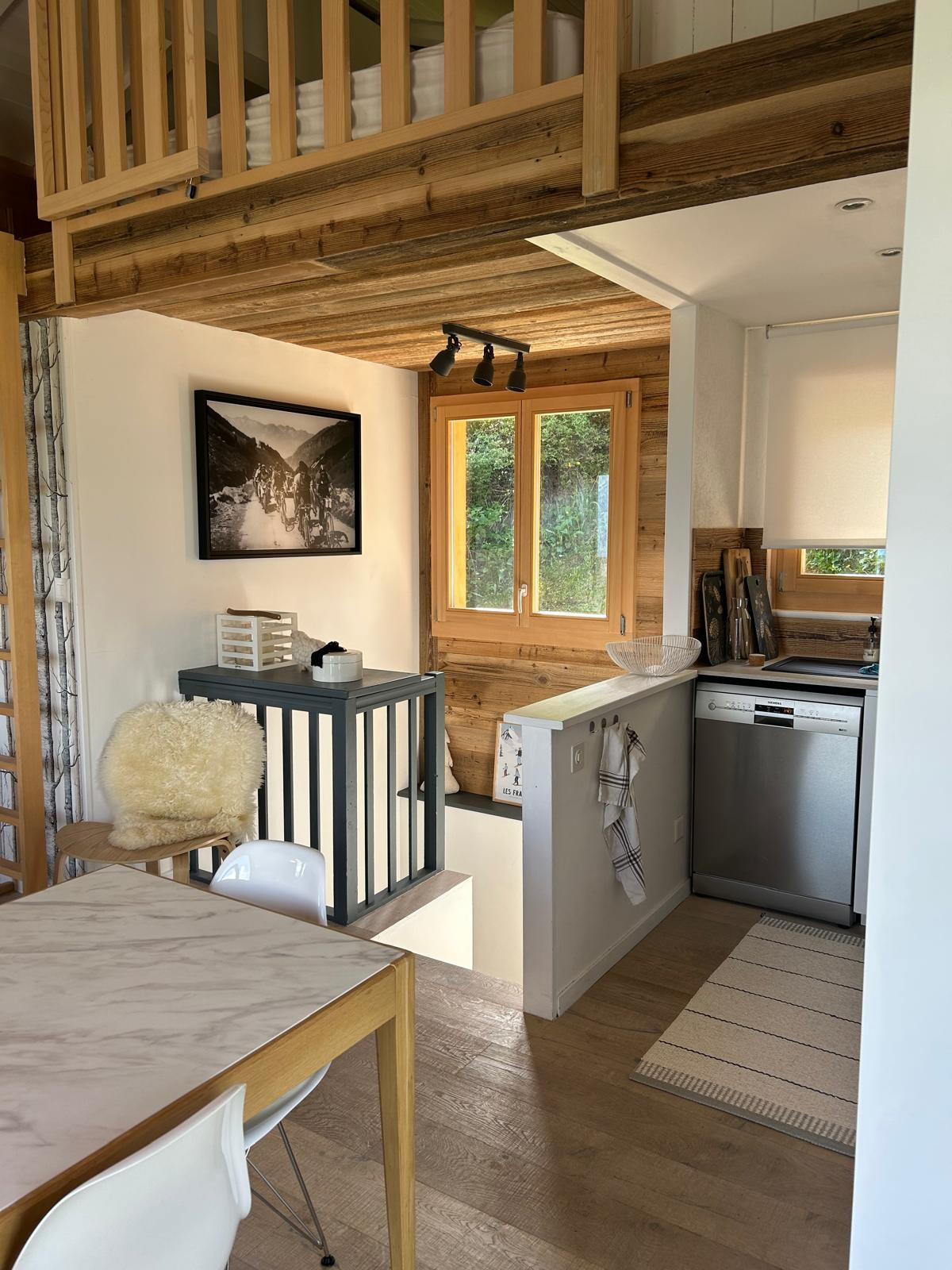 Al livello ingresso: soggiorno con angolo salotto, TV, Wi-Fi - zona pranzo - cucina aperta attrezzata (3 piani cottura elettrici, forno, lavastoviglie, frigorifero, microonde, macchine per il caffè a filtro e Nespresso, tostapane, set per fonduta e raclette) - 1 wc separato con lavabo.