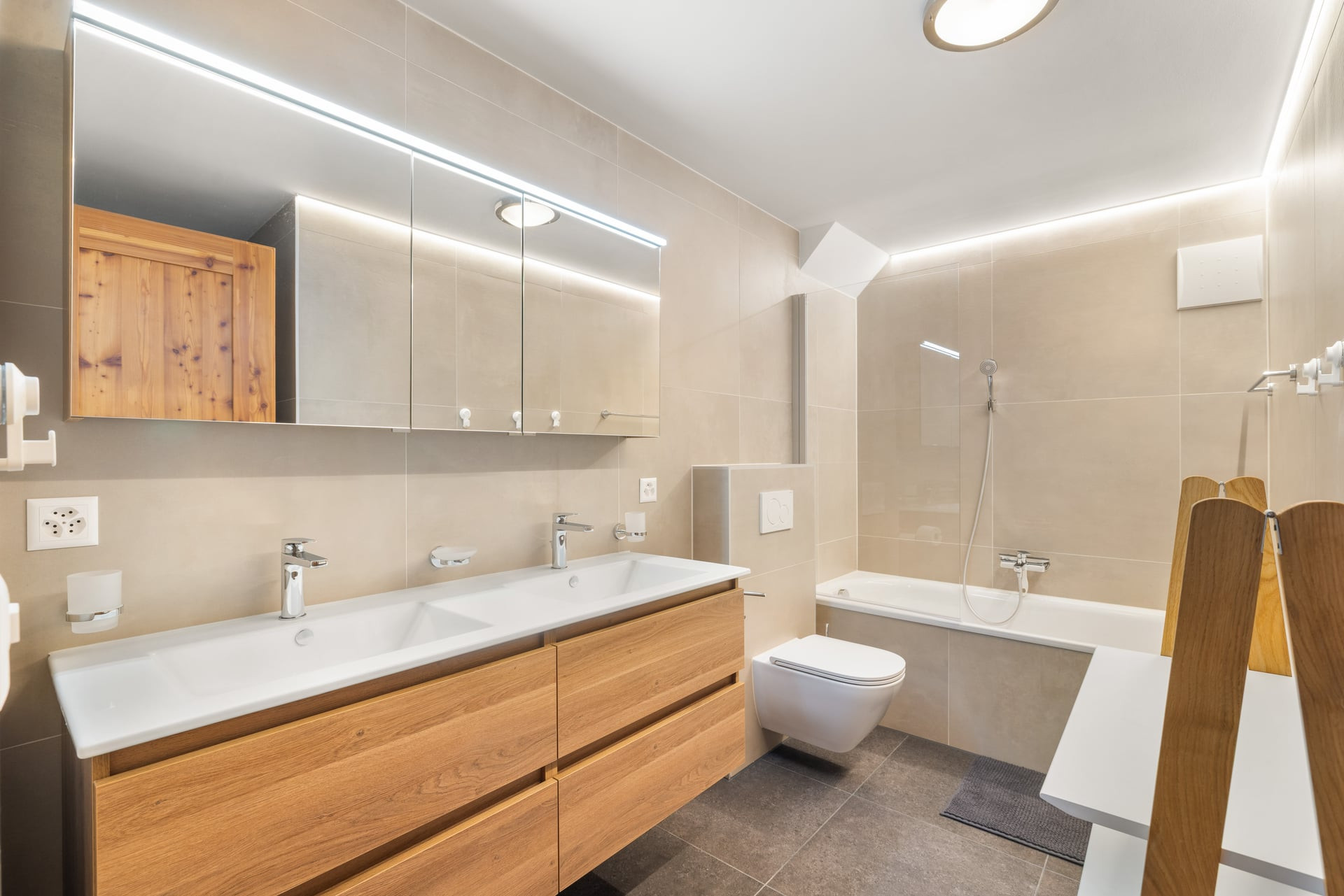 Une salle de bains avec baignoire, WC et double vasque