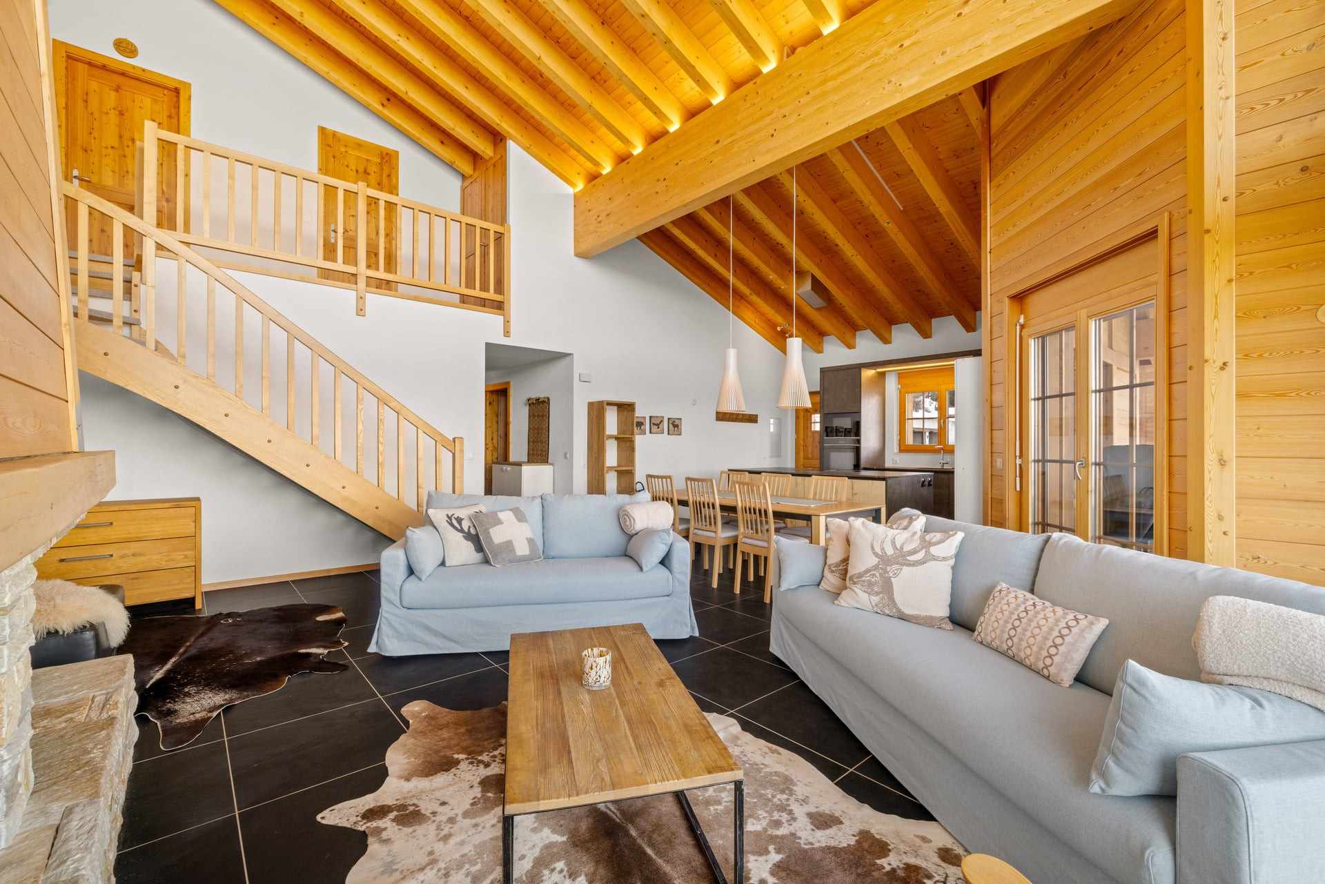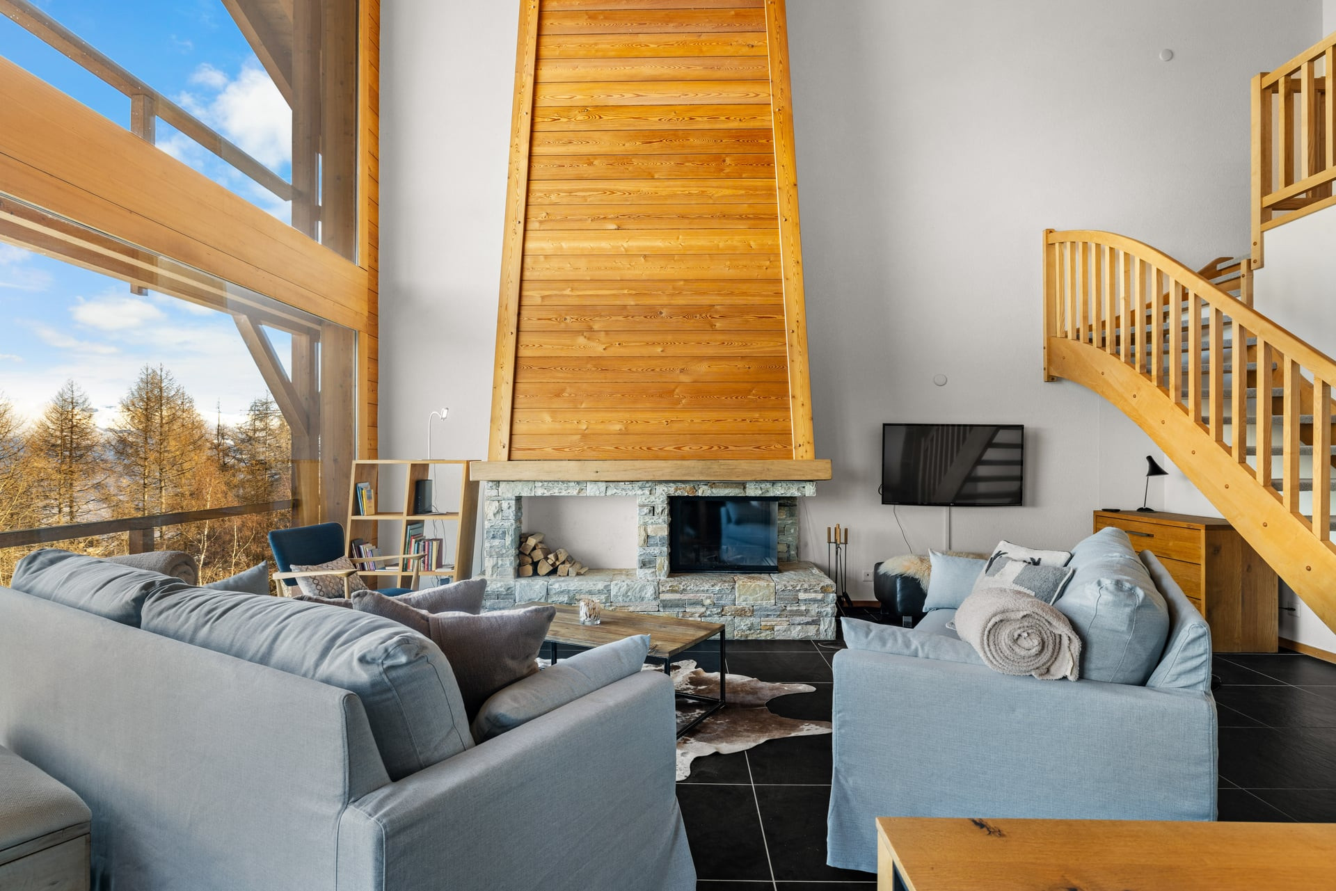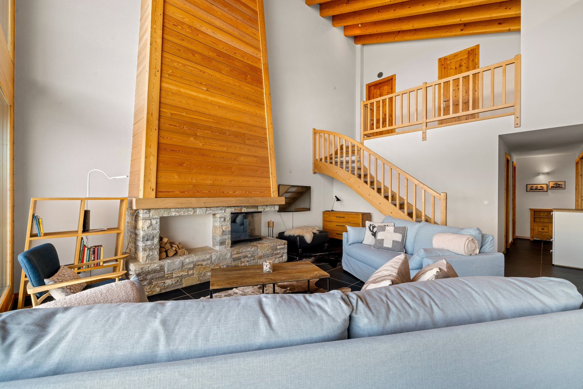Un vaste séjour ouvert jusqu’au toit, baigné de lumière, avec imposante cheminée et coin salon chaleureux