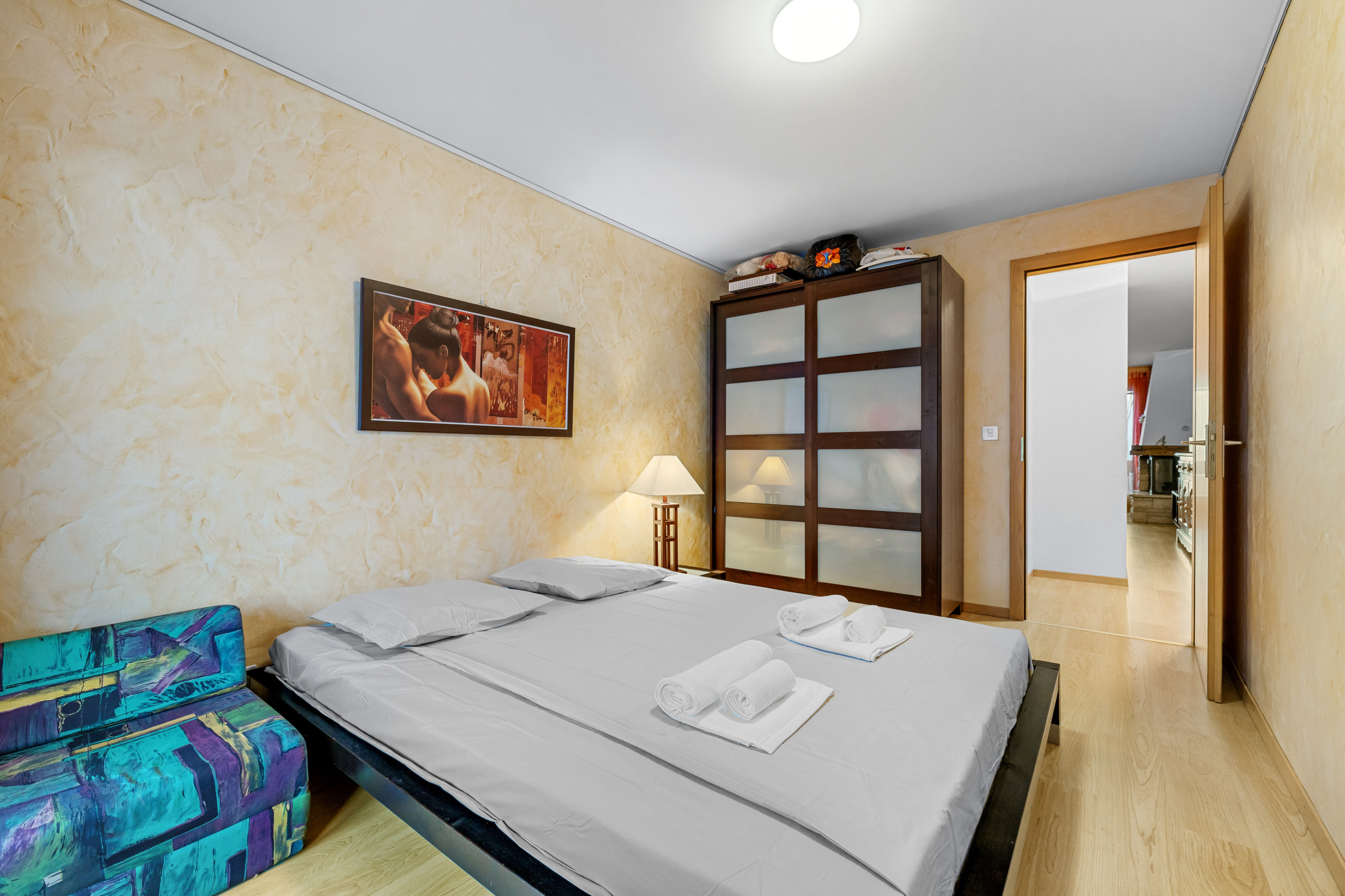 L'appartement dispose de deux chambres agencées avec soin : une chambre avec un lit queen size pour les parents, une autre avec un lit superposé et un lit individuel, permettant un hébergement flexible et confortable. La salle de bain avec baignoire et un toilette séparé complètent l'espace intérieur.
