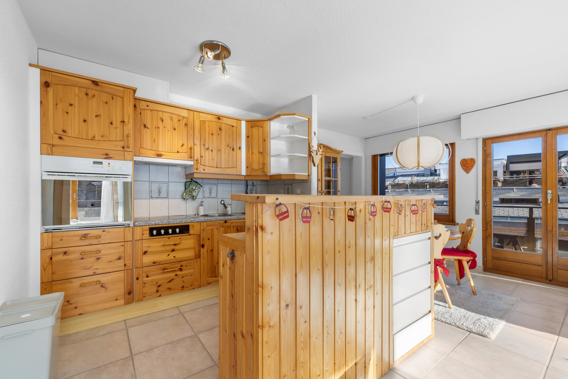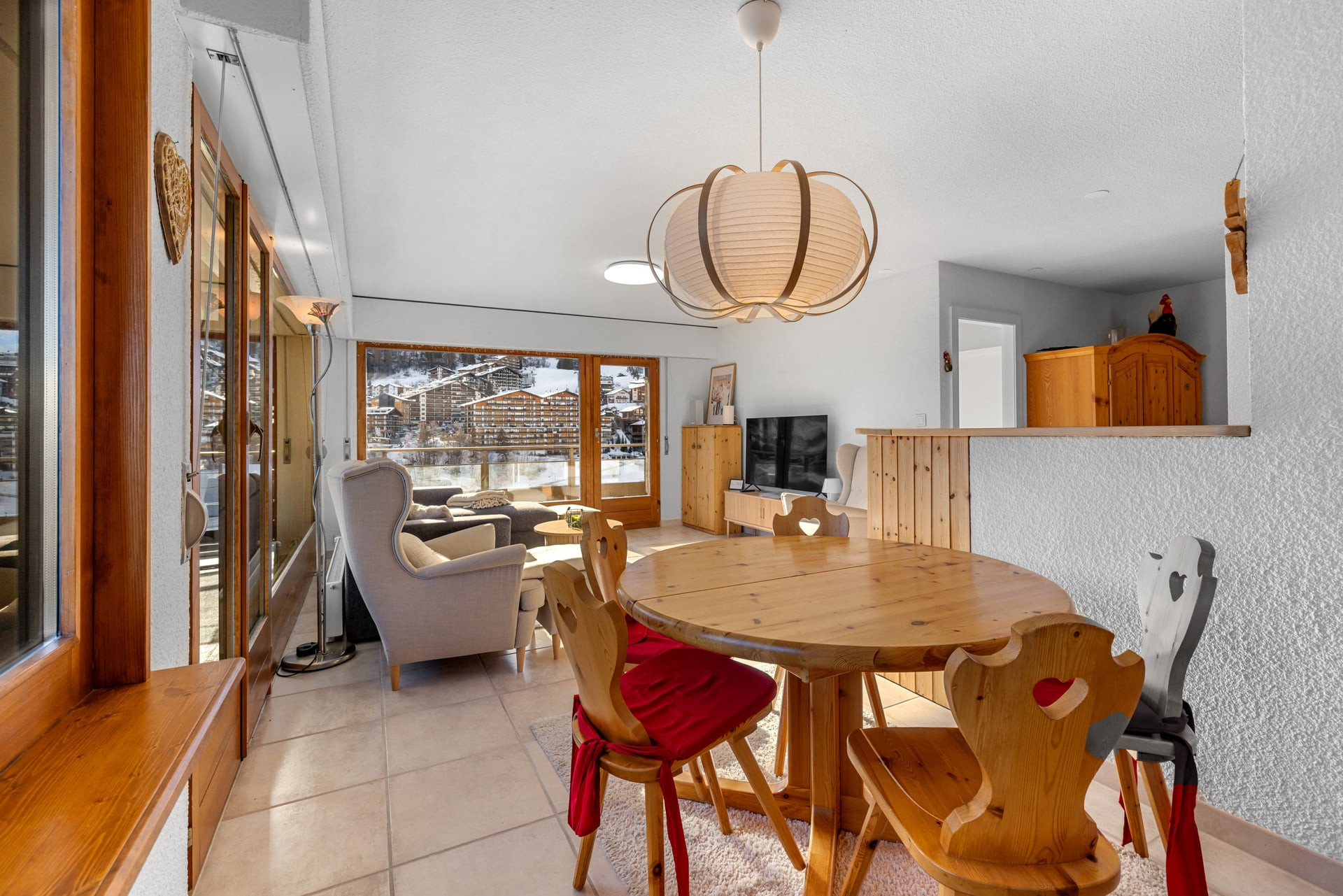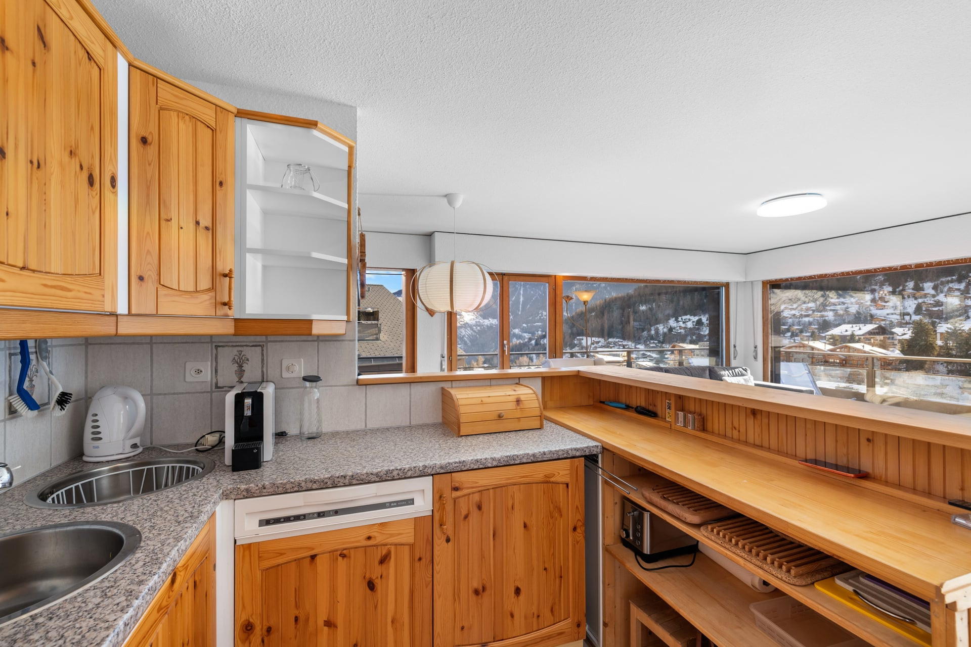 La cuisine ouverte, moderne et très bien équipée, vous permettra de cuisiner comme à la maison : réfrigérateur, lave-vaisselle, cuisinière vitrocéramique, toaster, bouilloire, machine à café à capsules, ainsi qu’un service à fondue et à raclette pour des moments conviviaux après une journée en plein air. Le coin à manger s’ouvre sur un salon chaleureux, équipé d’une Smart TV et d’une connexion Wi-Fi.