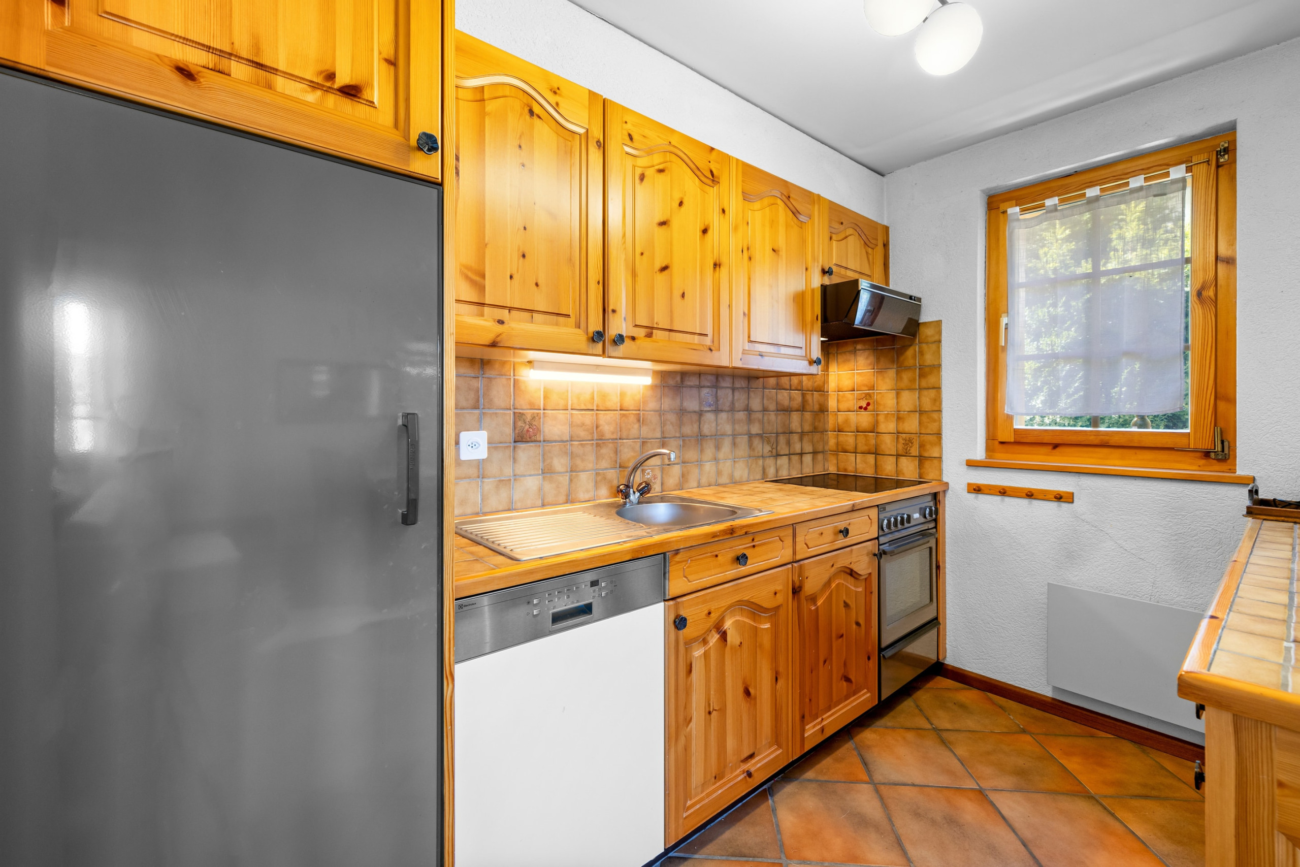 Au niveau de l'entrée : séjour avec coin salon, TV, wifi - coin à manger - cuisine ouverte équipée (3 plaques électriques, four, lave-vaisselle, réfrigérateur, micro-onde, machines à café filtre et à capsules Nespresso, grille-pain, bouilloire, service à fondue et à raclette) - 1 wc séparé avec lavabo