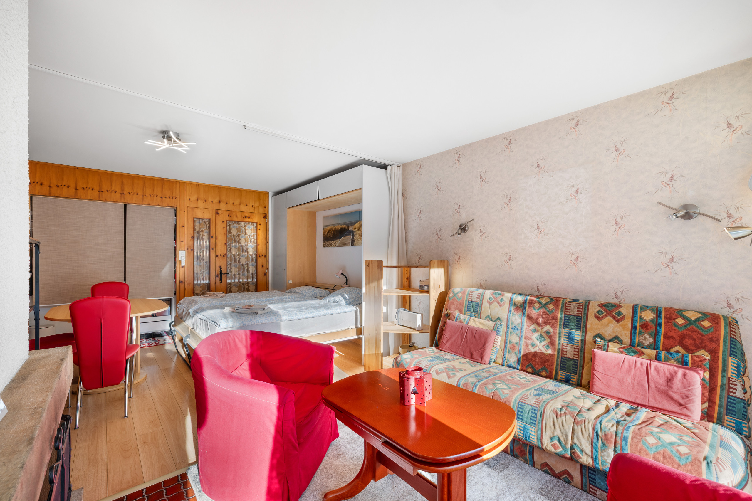 Confortable studio, env. 32 m2, pour 2 à 4 personnes, situé au 1er étage de la résidence Les Bouleaux, au centre de Haute-Nendaz.